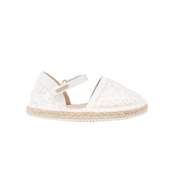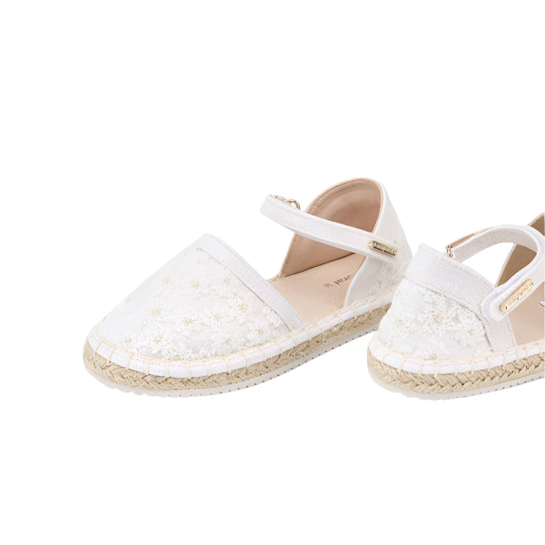 These Mayoral Metallic Floral Espadrilles for girls in ecru and gold bring a touch of glamour and charm to any outfit. The soft ecru fabric is beautifully complemented by shimmering gold floral embroidery, creating an elegant and playful look. Designed with comfort in mind, these espadrilles feature a breathable fabric lining and a cushioned insole for all-day wear. The classic jute sole adds a natural, summery vibe, while the non-slip rubber bottom ensures a secure grip with every step. Perfect for casual outings, garden parties, or beach days, these espadrilles are a stylish and versatile choice for your little one.