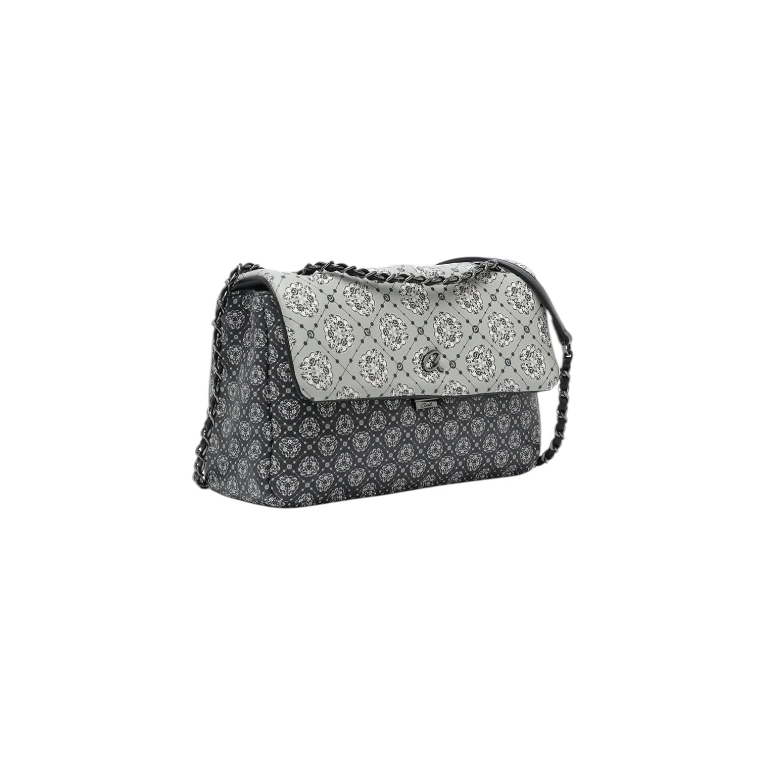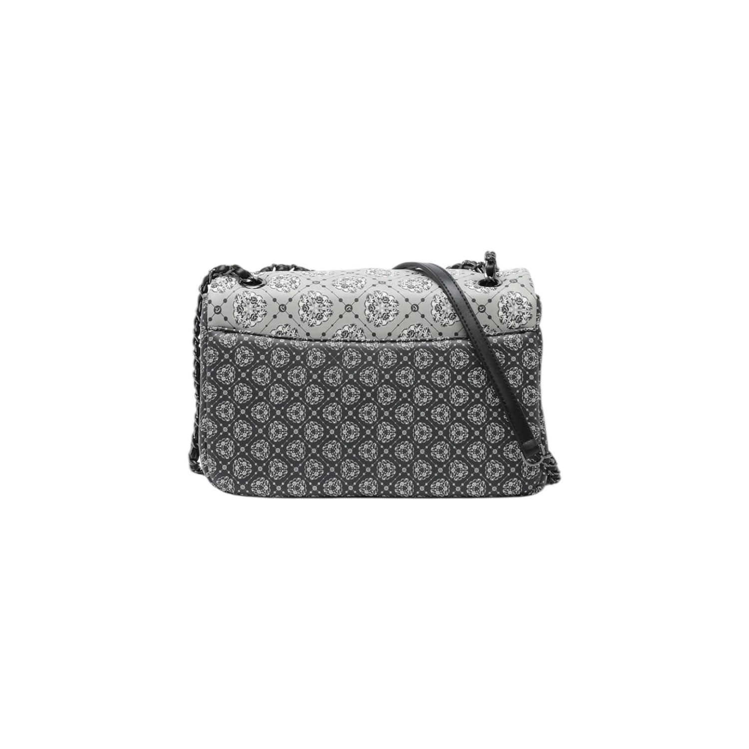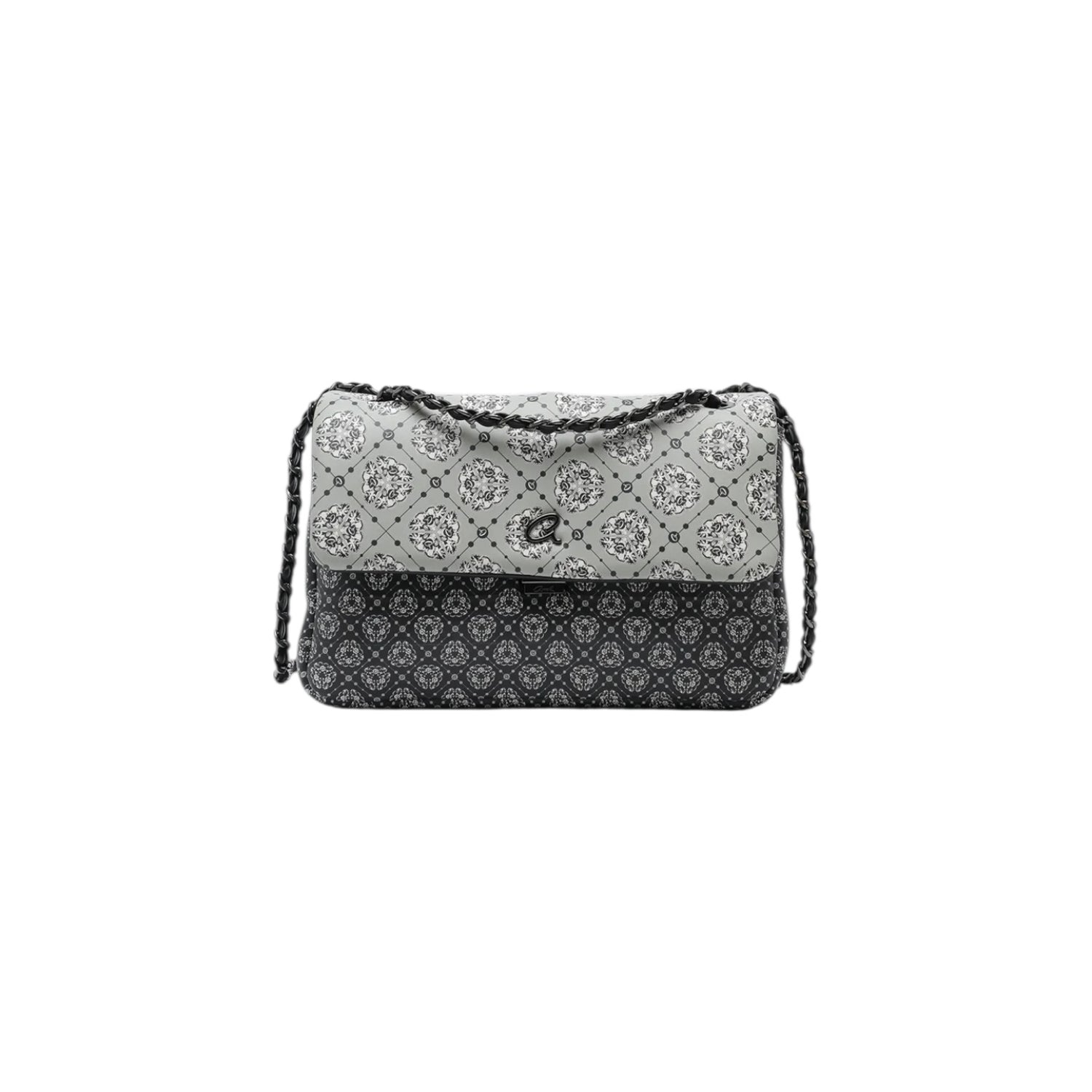 Women's Malin shoulder bag with double chain. It is made of soft-textured faux leather with butterfly print in two shades. Inside, it is divided into two open compartments and one zippered compartment and contains lining, an open compartment and a zippered pocket. Outside, it has a quick-access pocket on the back and secures with a metal clasp. An ideal choice for every day.