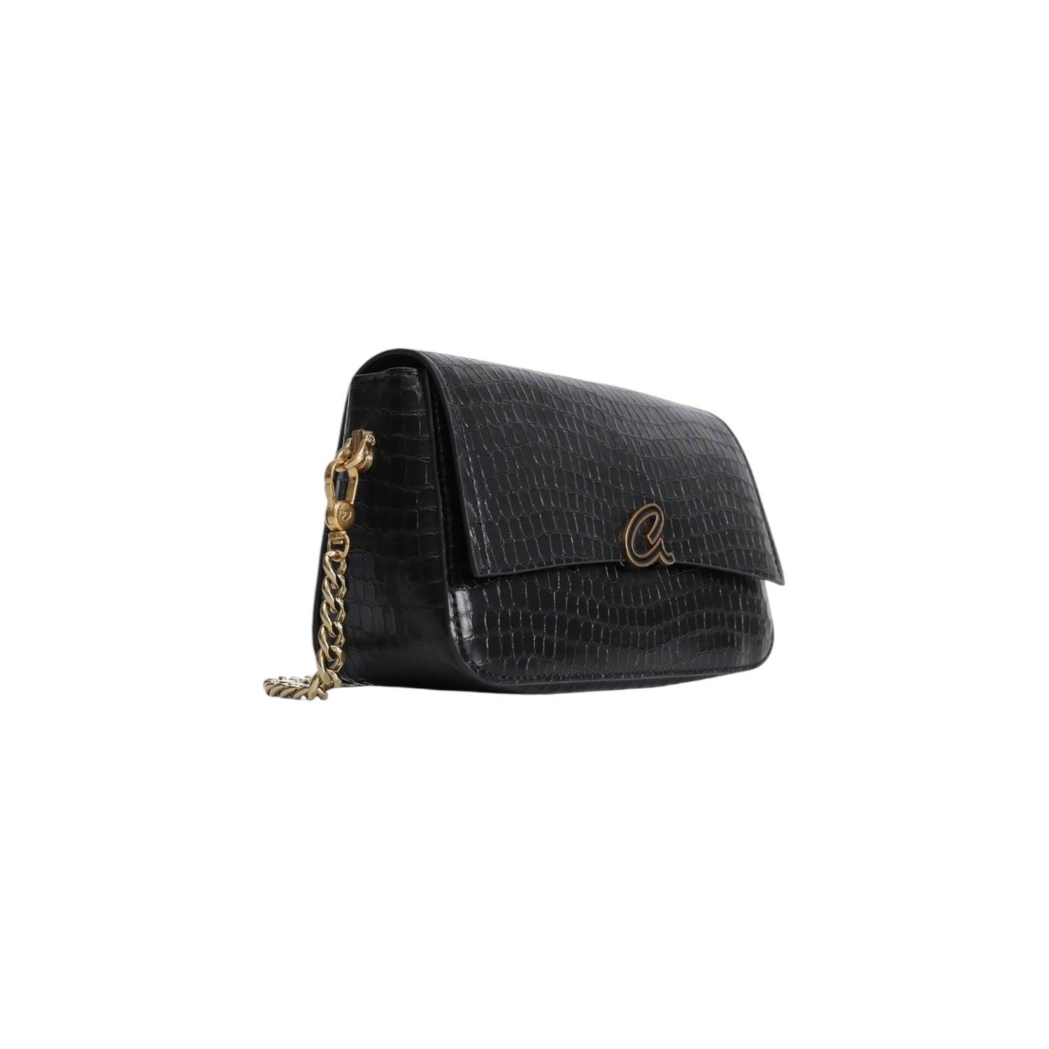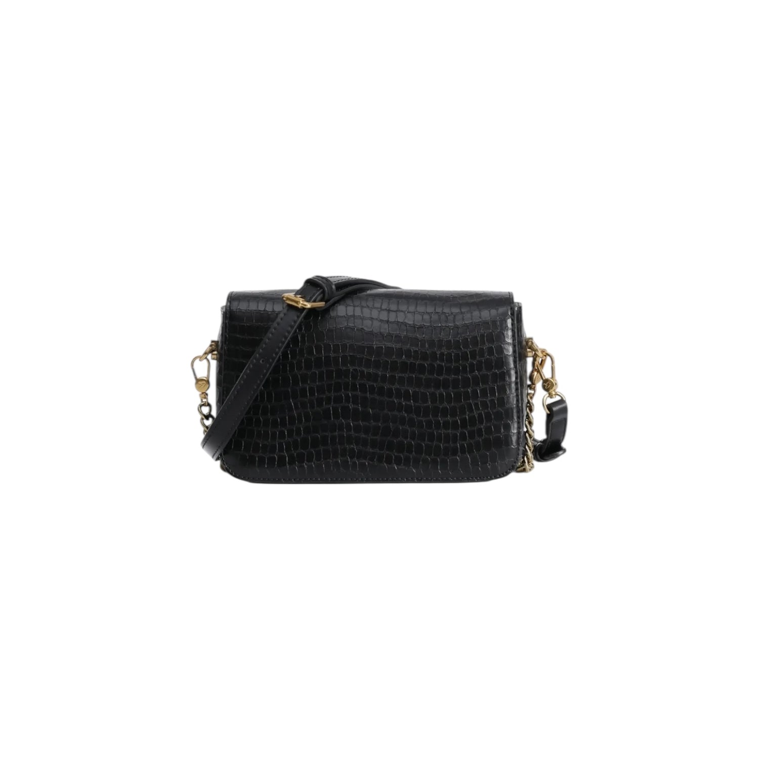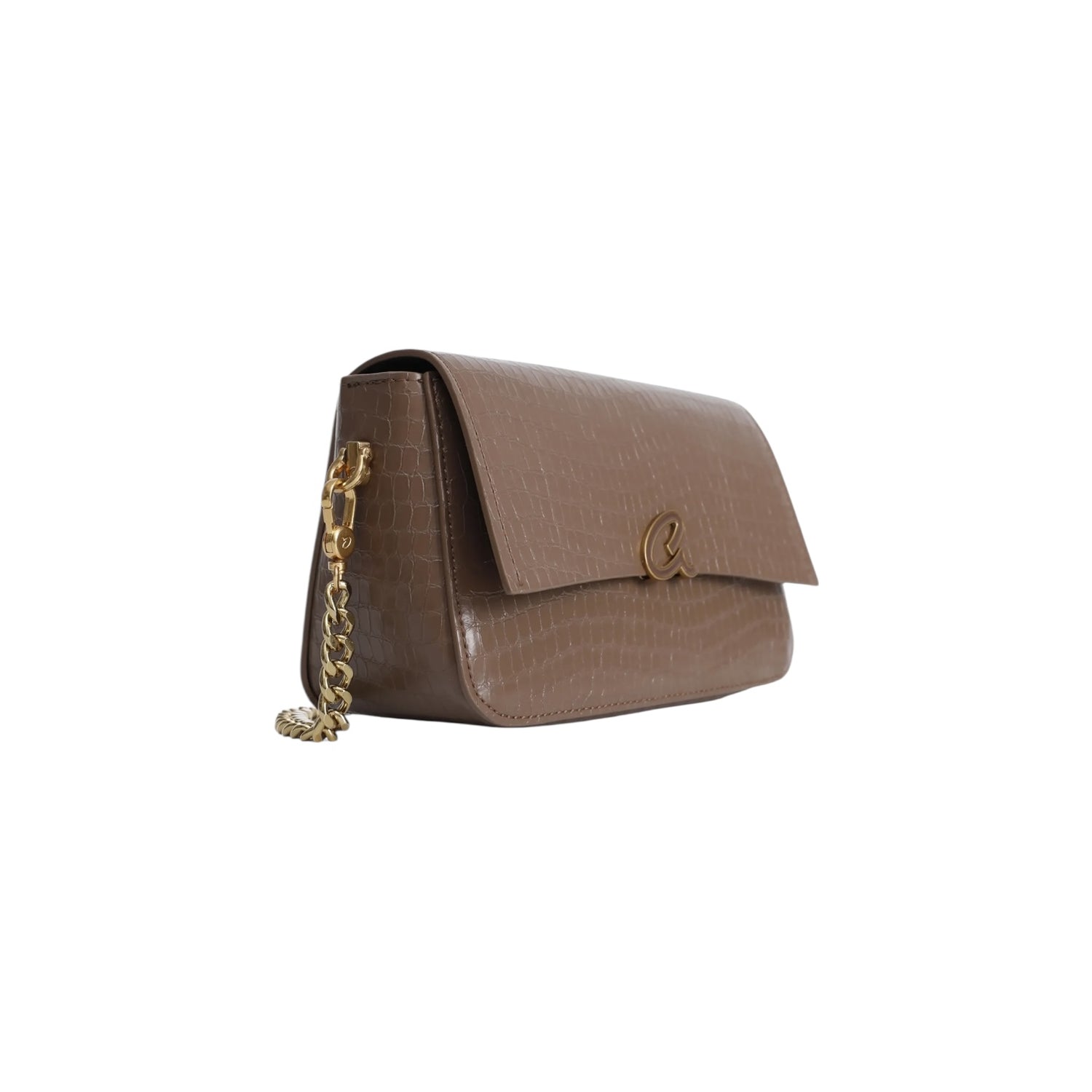 Avelina small women's bag made of faux leather with croco texture. It can be worn as a crossbody by its strap or on the shoulder with the gold chain it has. It secures with a flap and a gold magnetic clasp in 'a' shape. The interior is divided into three sections, contains a pocket and a zippered compartment while it is fully lined. A bag that can be easily combined with morning or evening outfits.