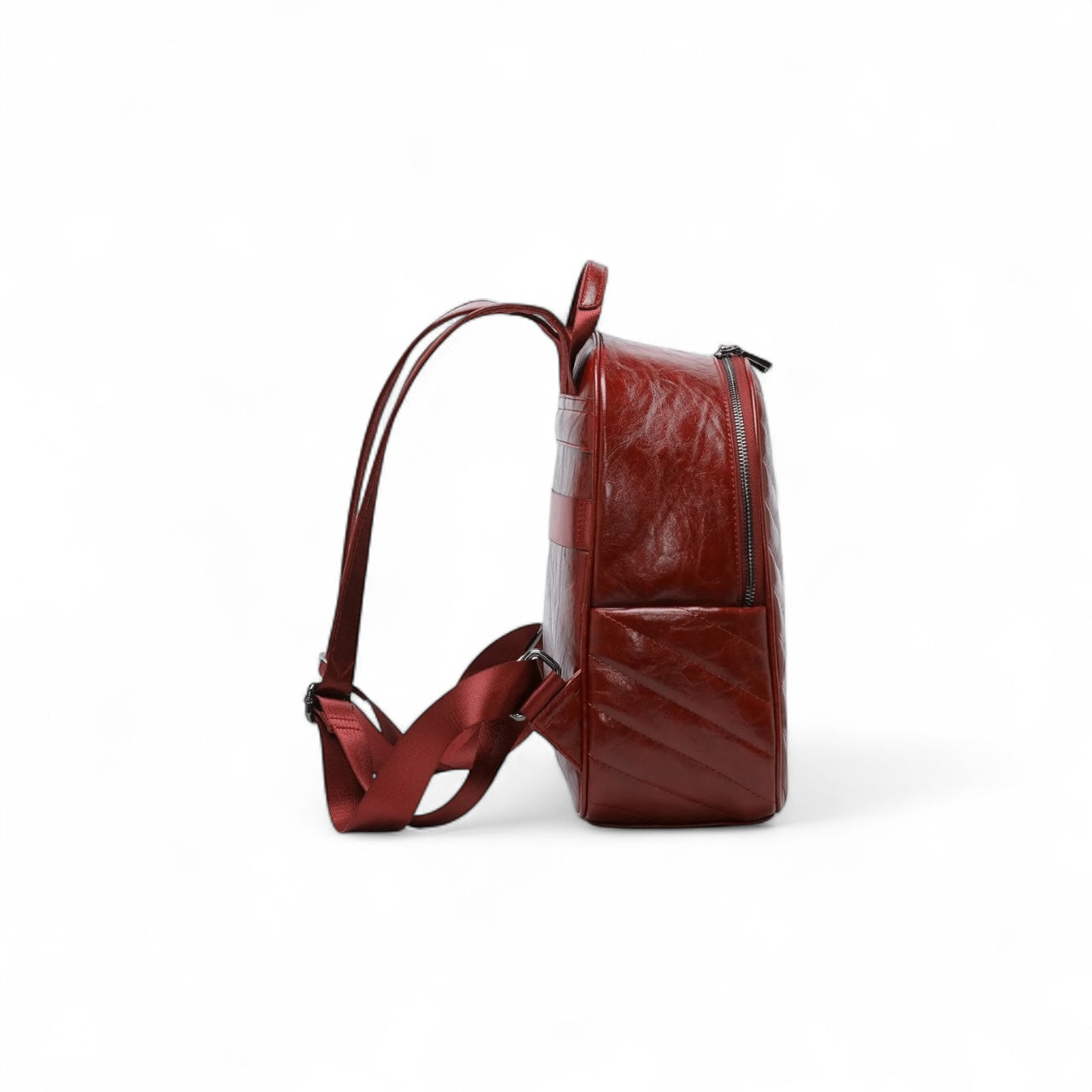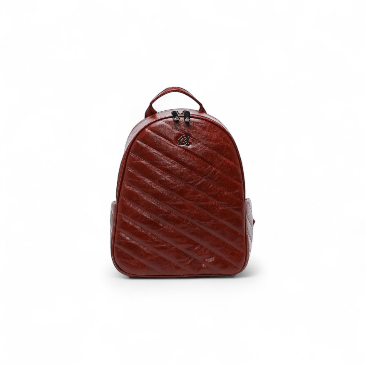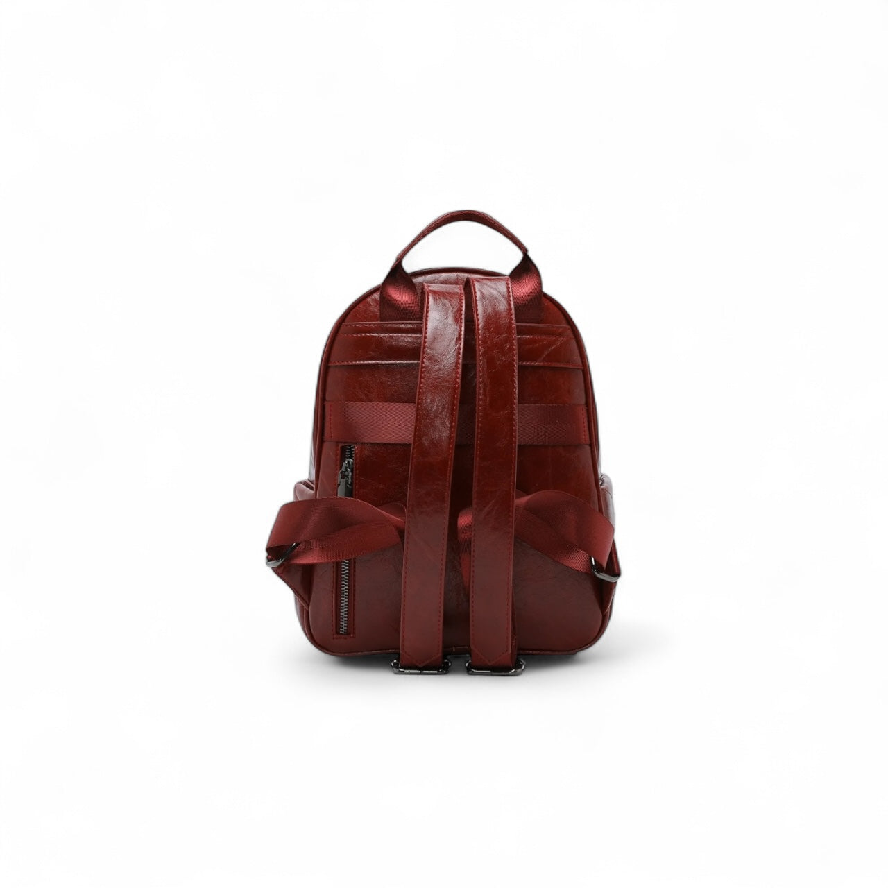 Women's Valeria backpack made of faux leather with seams. It is fully lined and has open compartments and a zippered pocket inside, for organizing small items. The backpack straps are adjustable and has an additional strap for attaching to a suitcase. It closes with a double metal zipper. A very special backpack, with a large capacity, suitable for serving everyday needs.