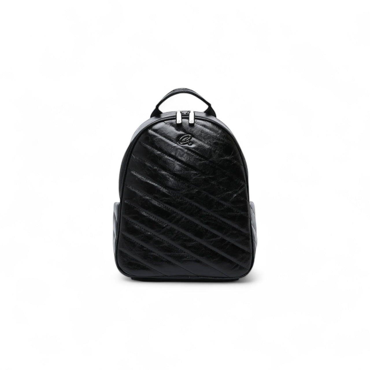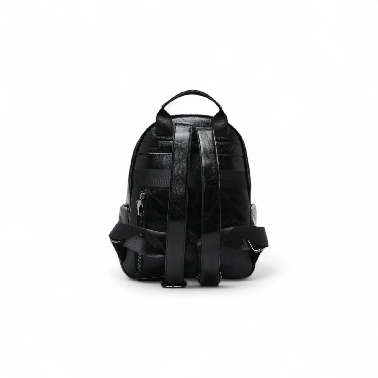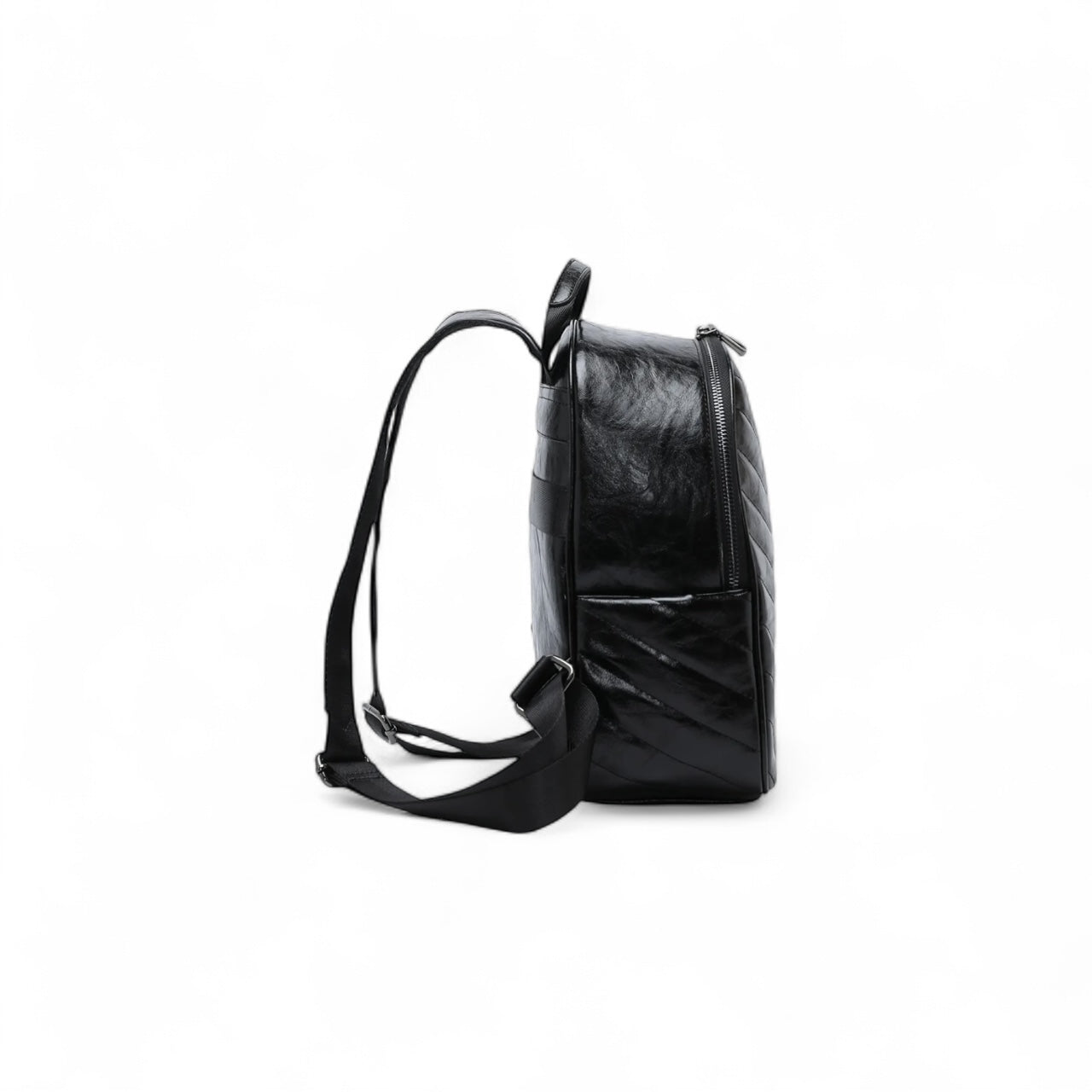 Women's Valeria backpack made of faux leather with seams. It is fully lined and has open compartments and a zippered pocket inside, for organizing small items. The backpack straps are adjustable and has an additional strap for attaching to a suitcase. It closes with a double metal zipper. A very special backpack, with a large capacity, suitable for serving everyday needs.