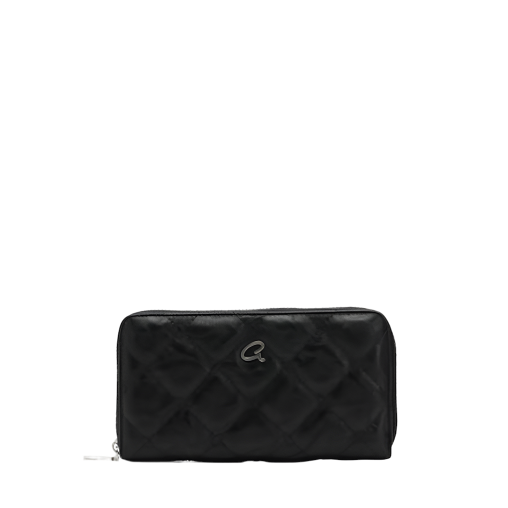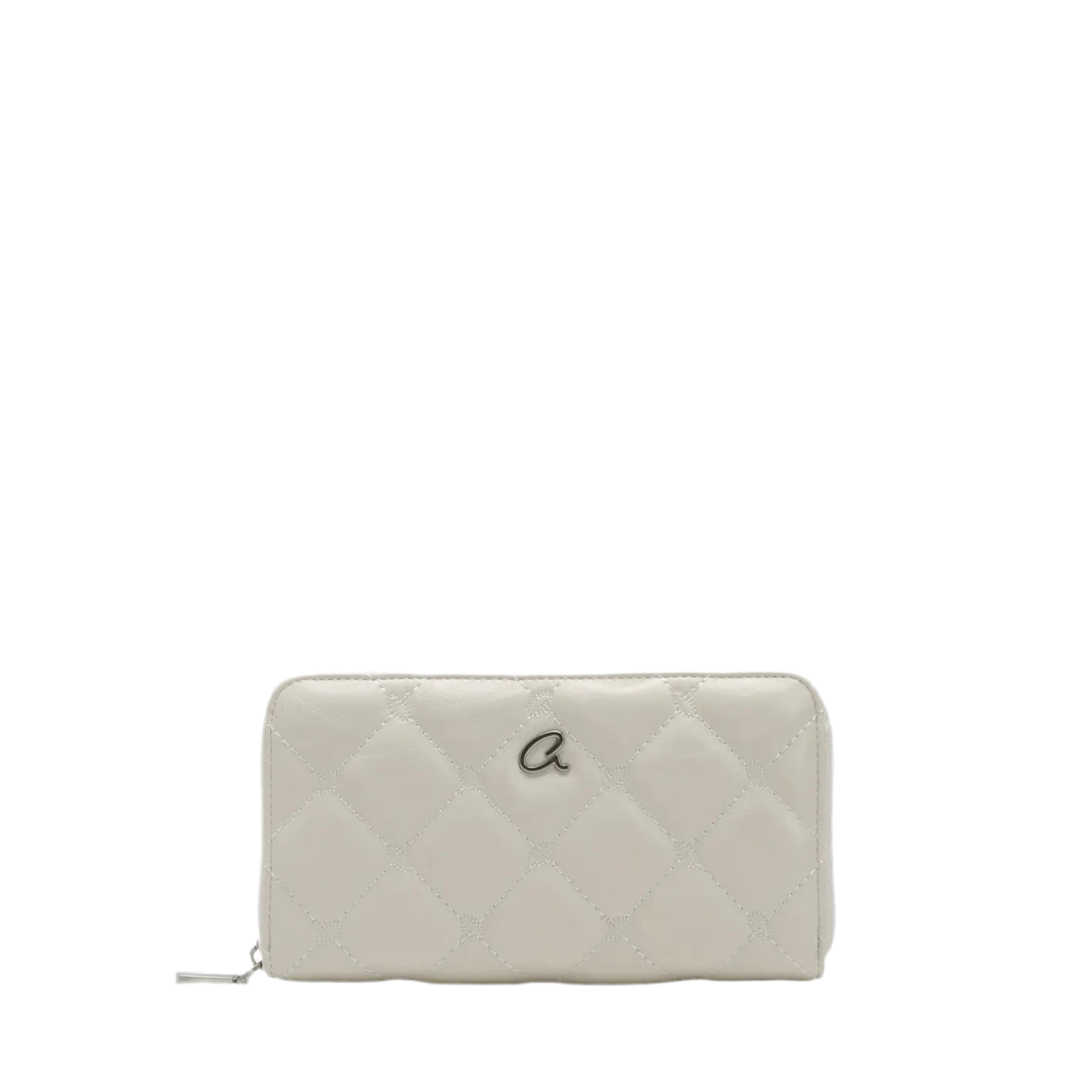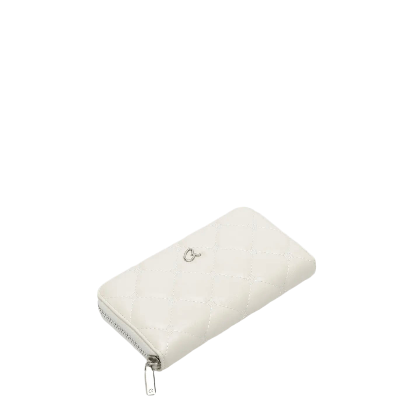 Delores women's wallet with a unique 'a' axel quilted design. Inside it includes a zip coin pocket, and multiple slots for cards and banknotes. With metallic matte details in a silver tone and zipper closure. Spacious and practical for everyday carrying of small items.