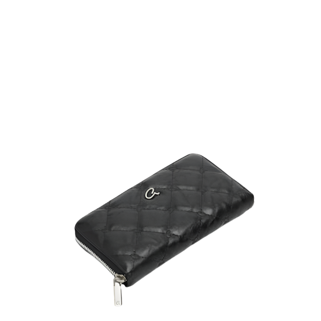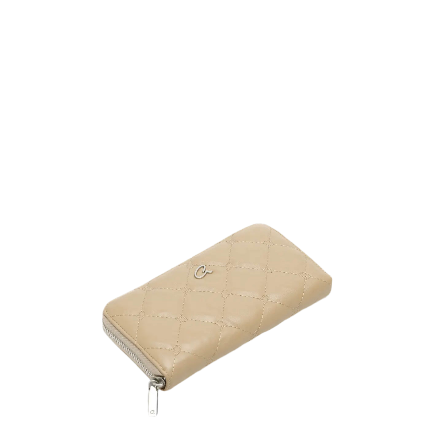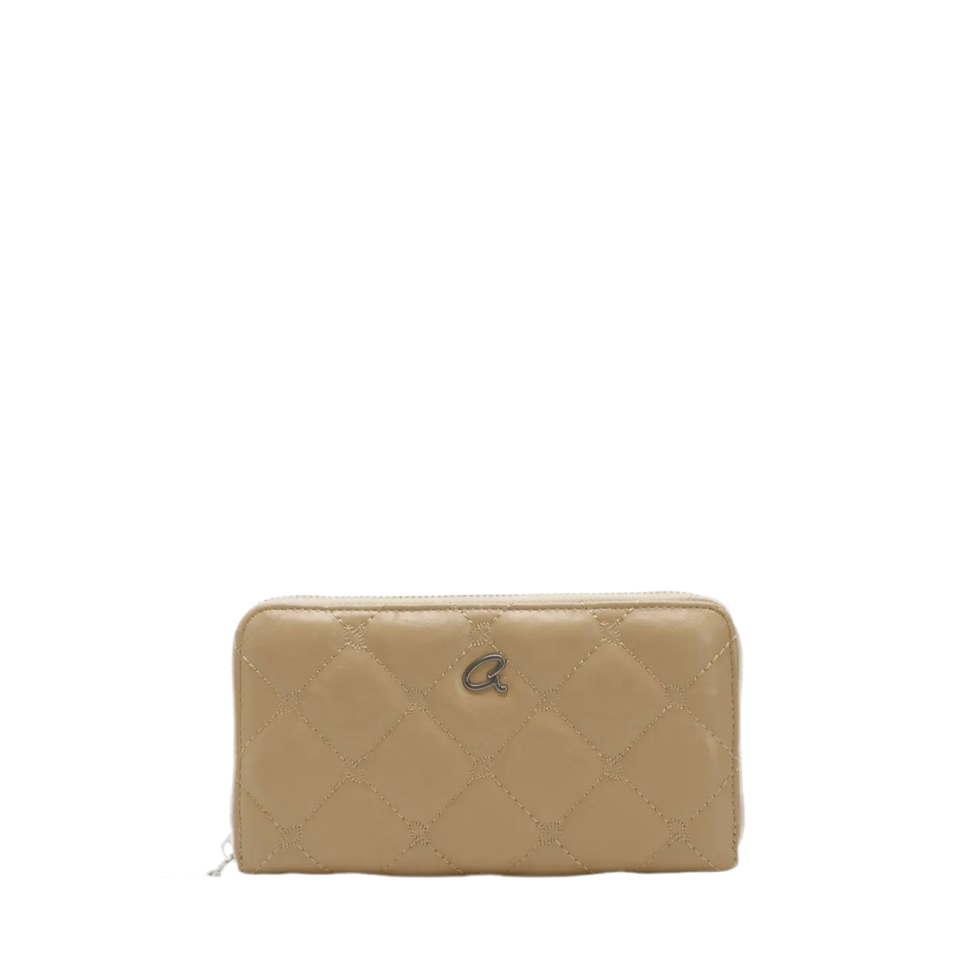 Delores women's wallet with a unique 'a' axel quilted design. Inside it includes a zip coin pocket, and multiple slots for cards and banknotes. With metallic matte details in a silver tone and zipper closure. Spacious and practical for everyday carrying of small items.