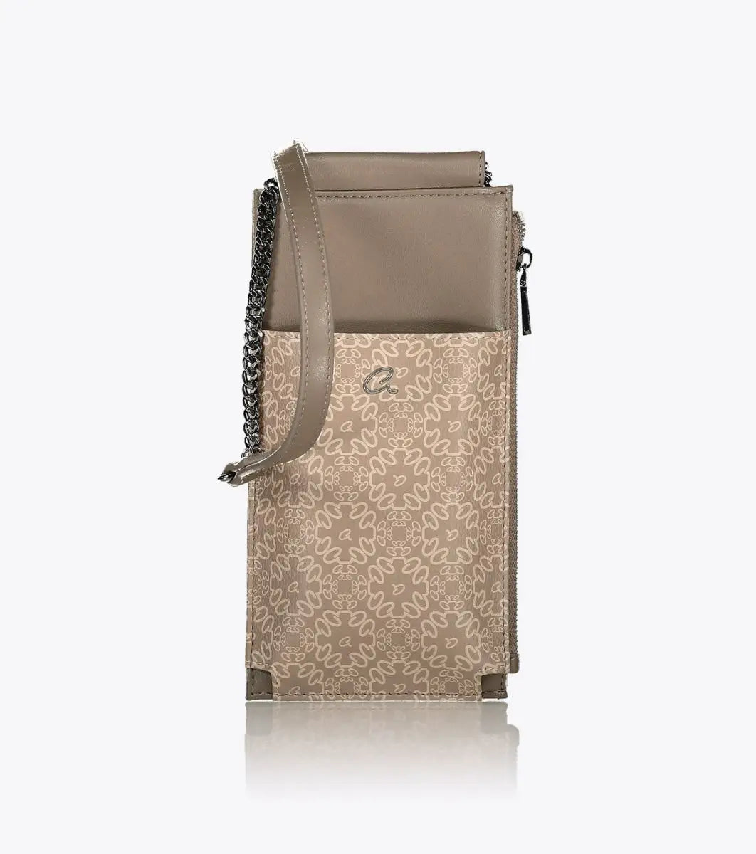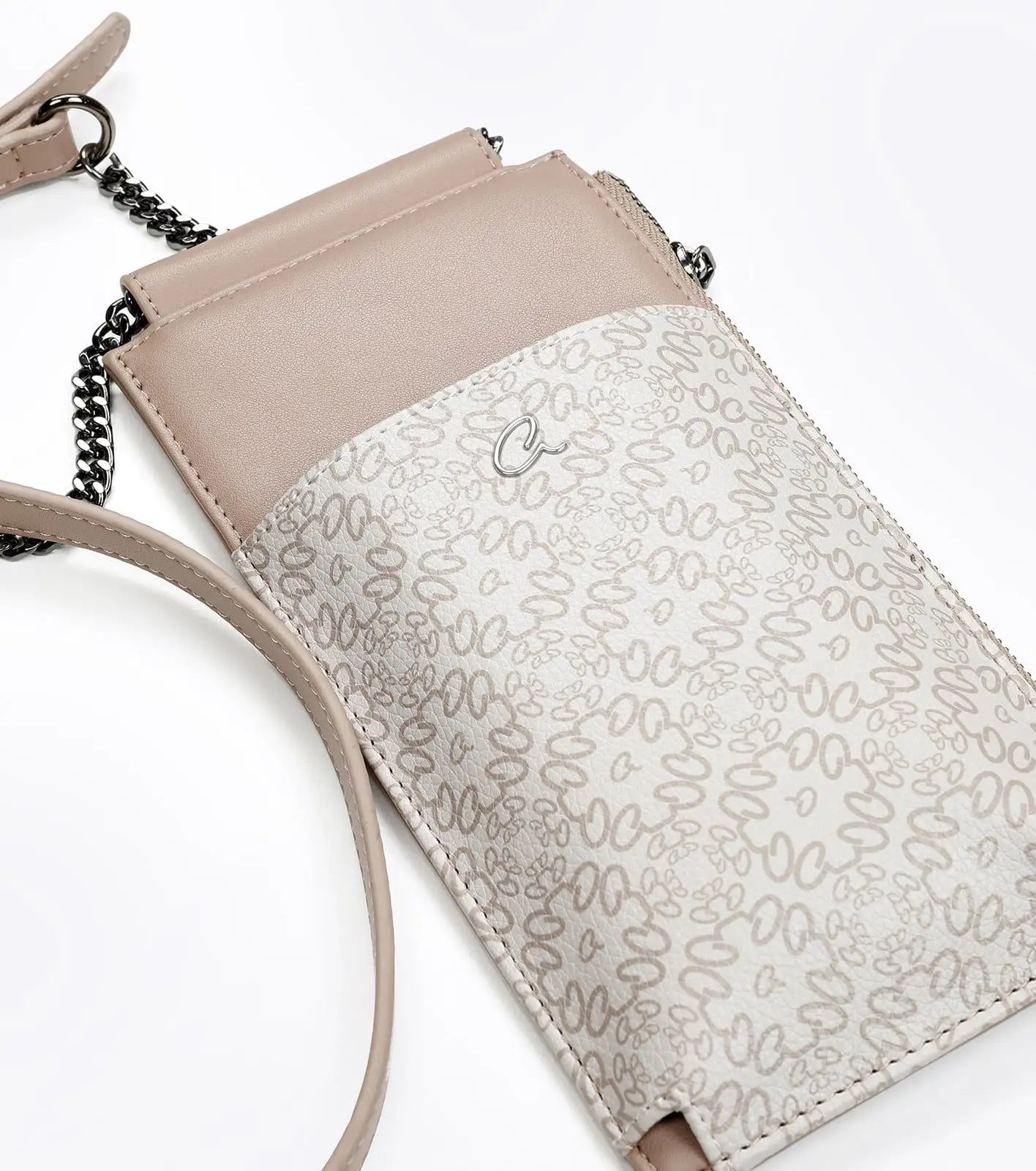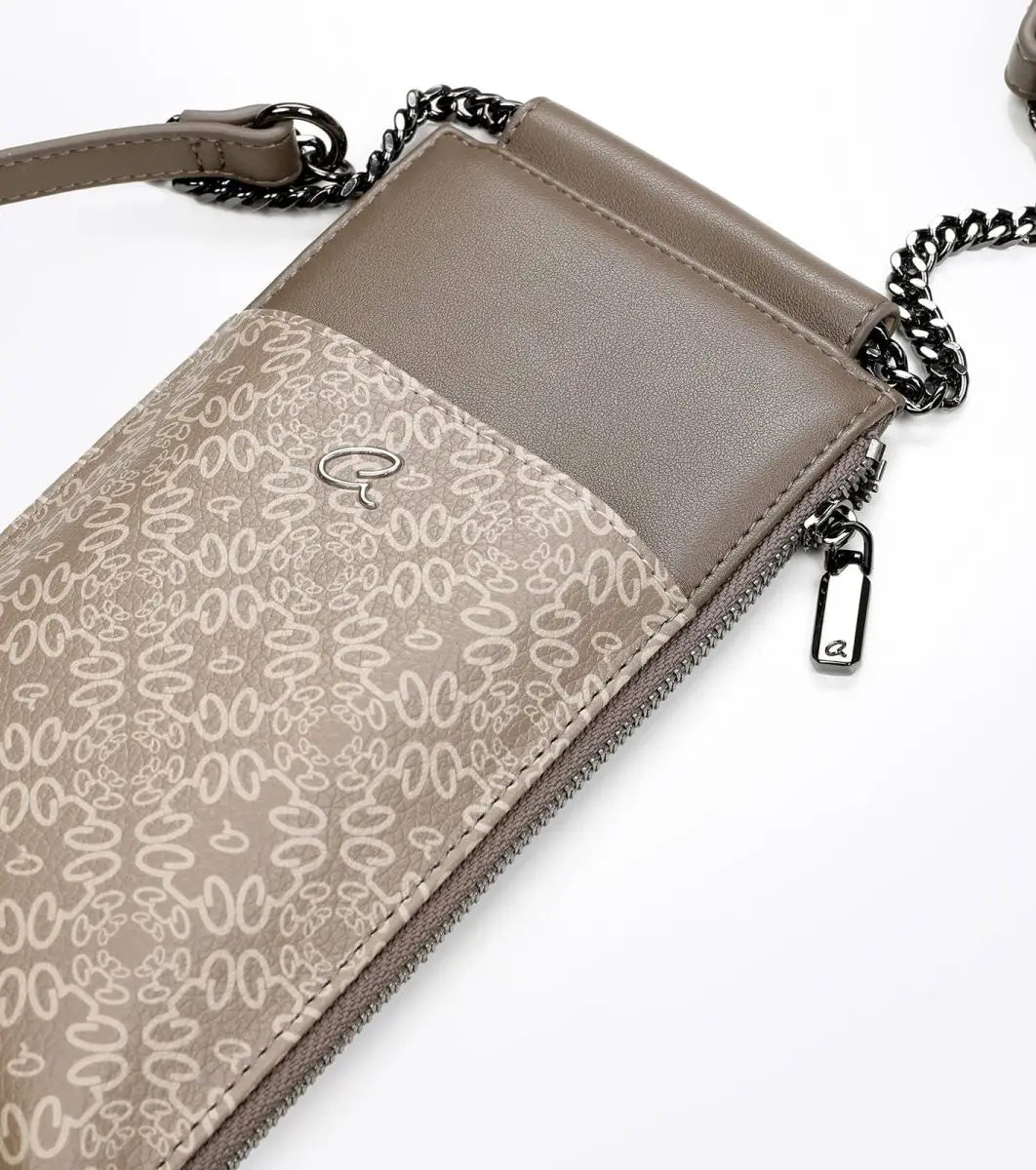 Θήκη για κινητό με τύπωμα αλυσίδα μονόγραμμα 'α'. Με αλυσίδα στο λουράκι και θήκη με φερμουάρ που λειτουργεί ως πορτοφόλι. Θέσεις για χαρτονομίσματα, κέρματα και κάρτες. Κατασκευασμένη από υψηλής ποιότητας συνθετικό δέρμα.