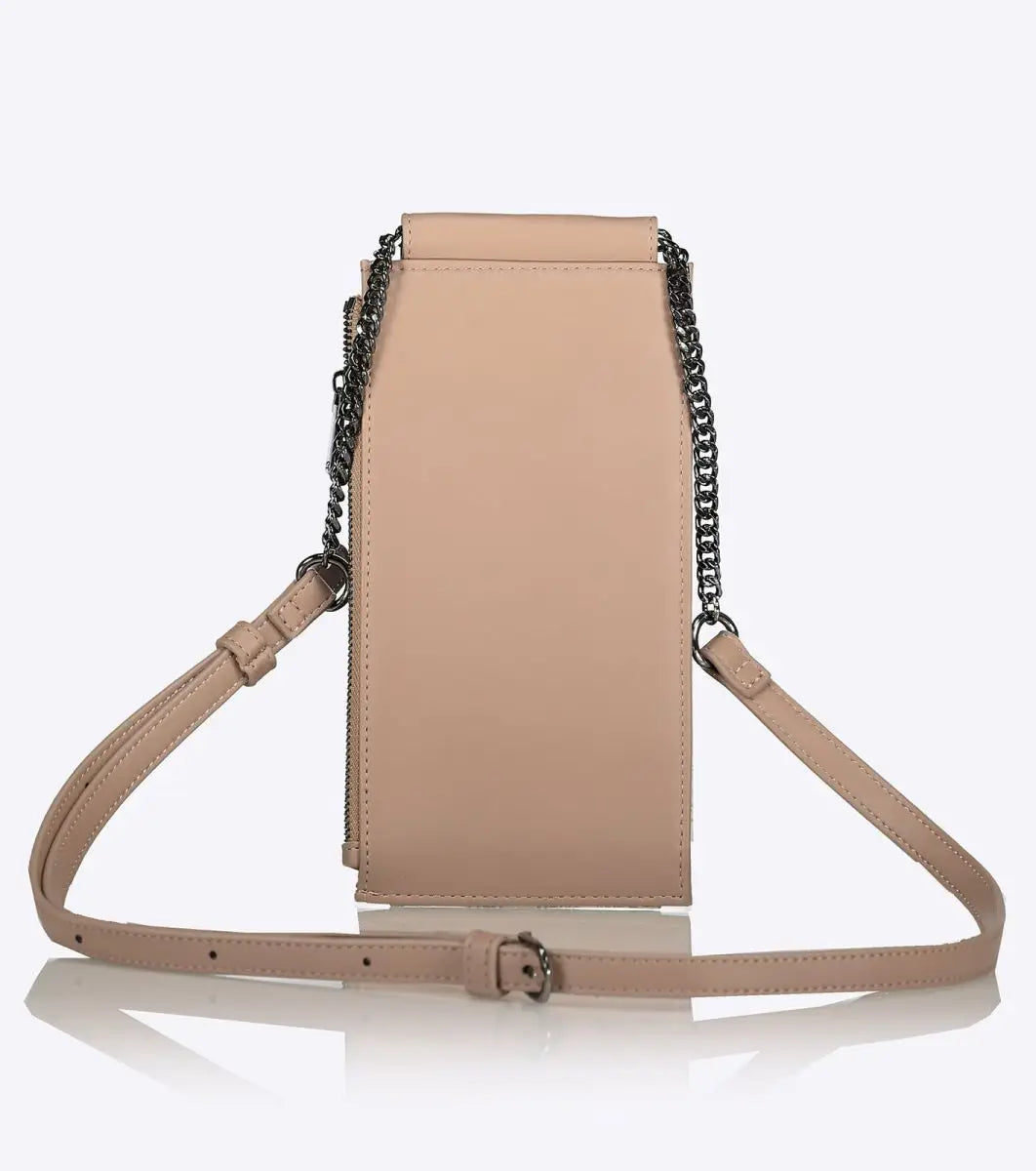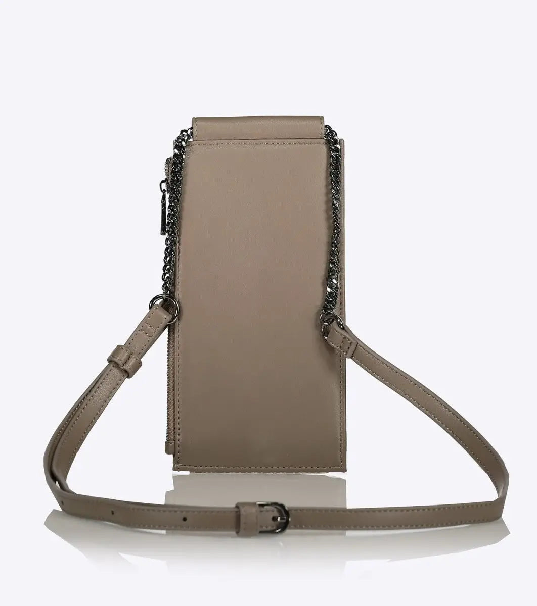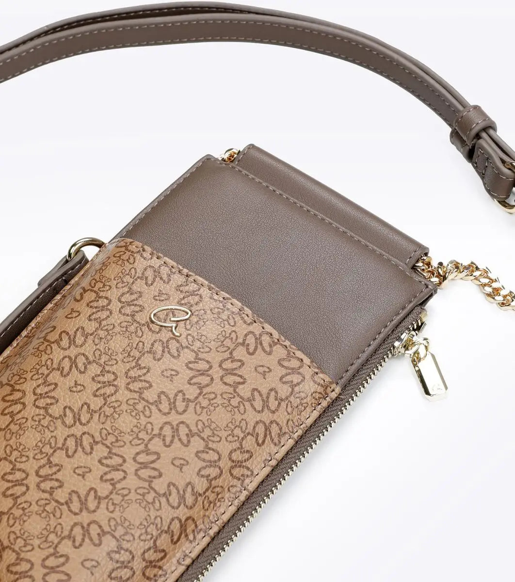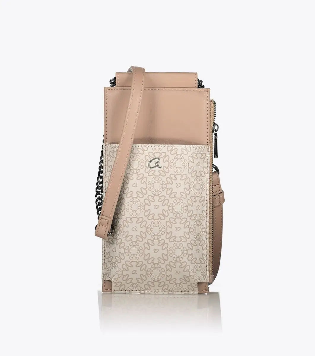 Θήκη για κινητό με τύπωμα αλυσίδα μονόγραμμα 'α'. Με αλυσίδα στο λουράκι και θήκη με φερμουάρ που λειτουργεί ως πορτοφόλι. Θέσεις για χαρτονομίσματα, κέρματα και κάρτες. Κατασκευασμένη από υψηλής ποιότητας συνθετικό δέρμα.