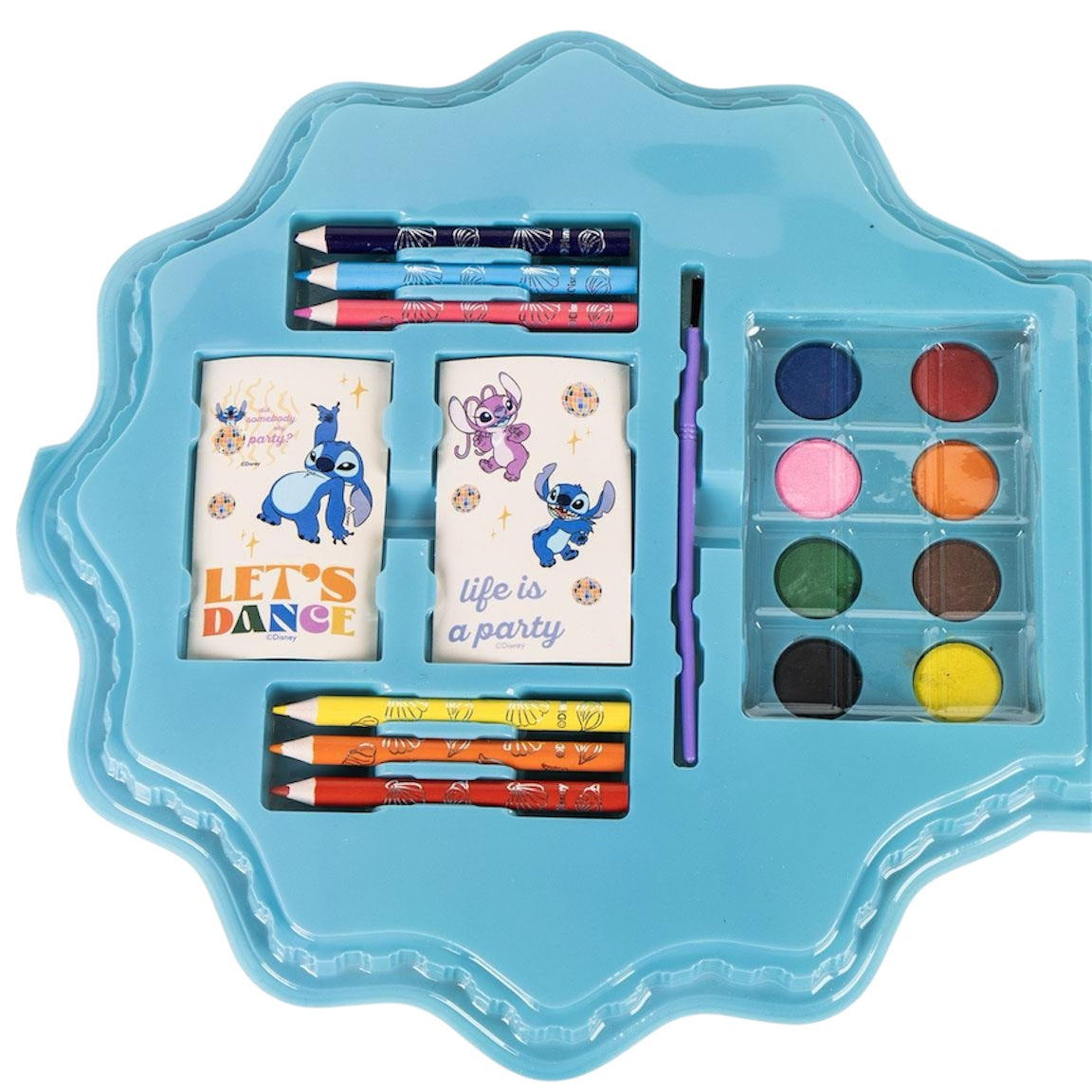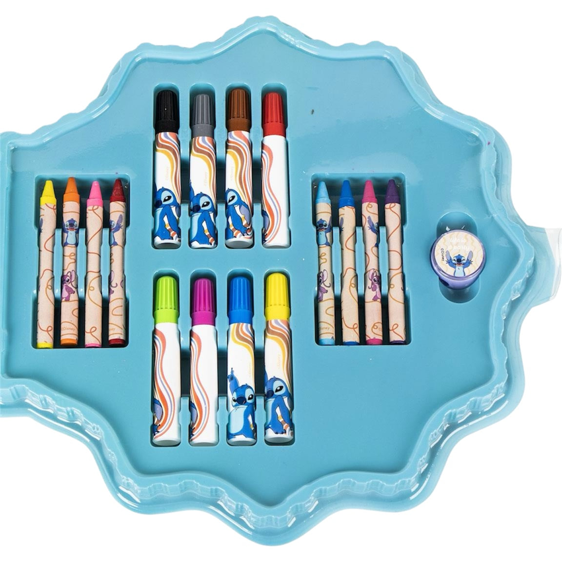 Stitch colouring stationery set in a sturdy box, including pens, pencils and accessories – perfect for creative kids.