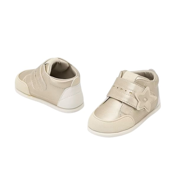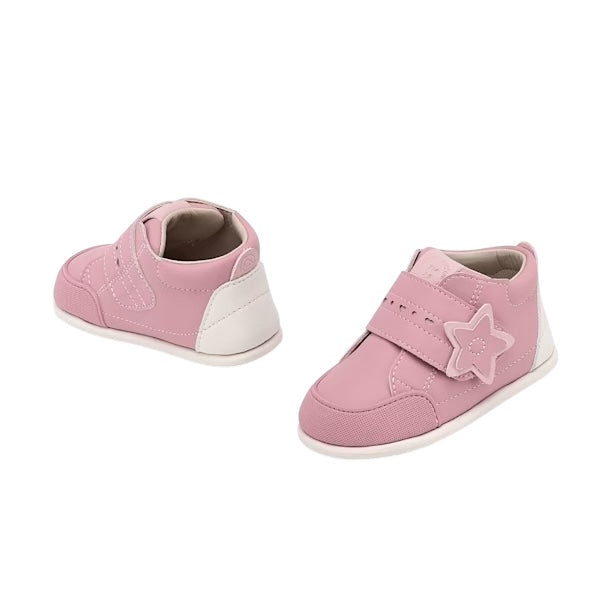 Sporty shoes for baby, highly versatile for their daily adventures. Leather effect outer material. Comfortable, extra-flexible, non-slip rubber sole for extra foot comfort. Adjustable velcro strap which guarantees a perfect fit. Star details. This design belongs to our Barefoot line, with a flat sole (zero drop), non-slip and rounded last, without reinforcements or metal parts. It is light, wide and respectful of children's feet. In addition, it has an antibacterial and breathable insole.