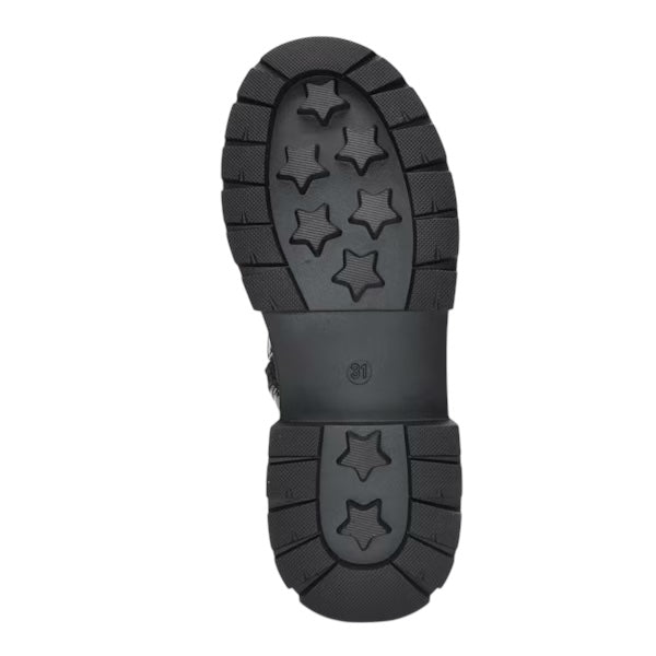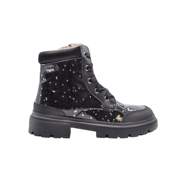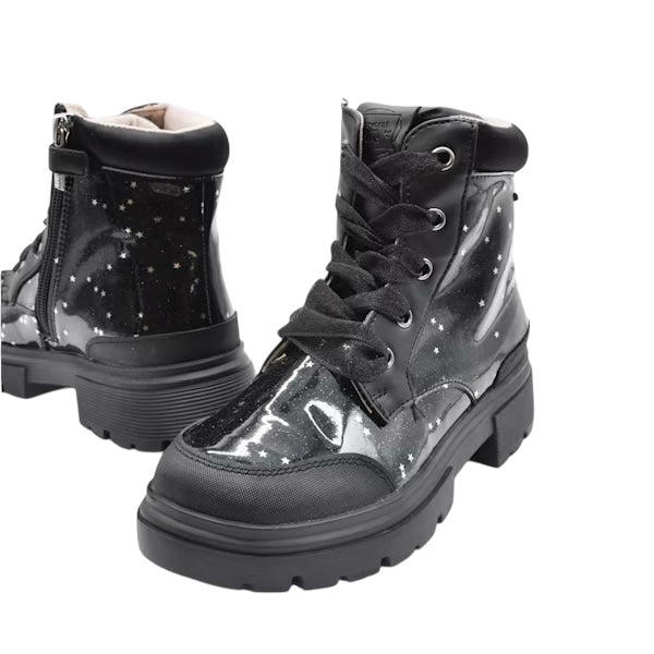 Children's ankle boots for girl essential in any winter wardrobe. A practical and warm shoe for the cold days . Leather effect outer material. Comfortable cork and non-slip serrated rubber sole for a strong grip shoe. Side zip fastening for a quick, simple fit. Glitter detailing.